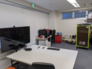 実験室内部です。web会議対応の打ち合わせスペース、3Dプリンター等も配備されています。