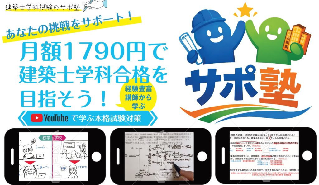 サポ塾は 一級・二級建築士の学科試験合格を目指すオンライン講座で、YouTubeメンバーシップを通じて5科目のLIVE講義や動画解説を配信しています。深い理解に基づく本質的な学習を重視した建築士試験対策コンテンツです。